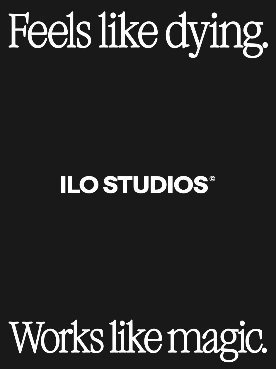 From this central idea we developed a verbal system built on contrast and candor: "Not always fun." "Feels like dying." "Works like magic." "Your stress leaves before you do." The kind of lines the wellness industry would never use. ILO does, because it respects its audience enough to tell the truth.