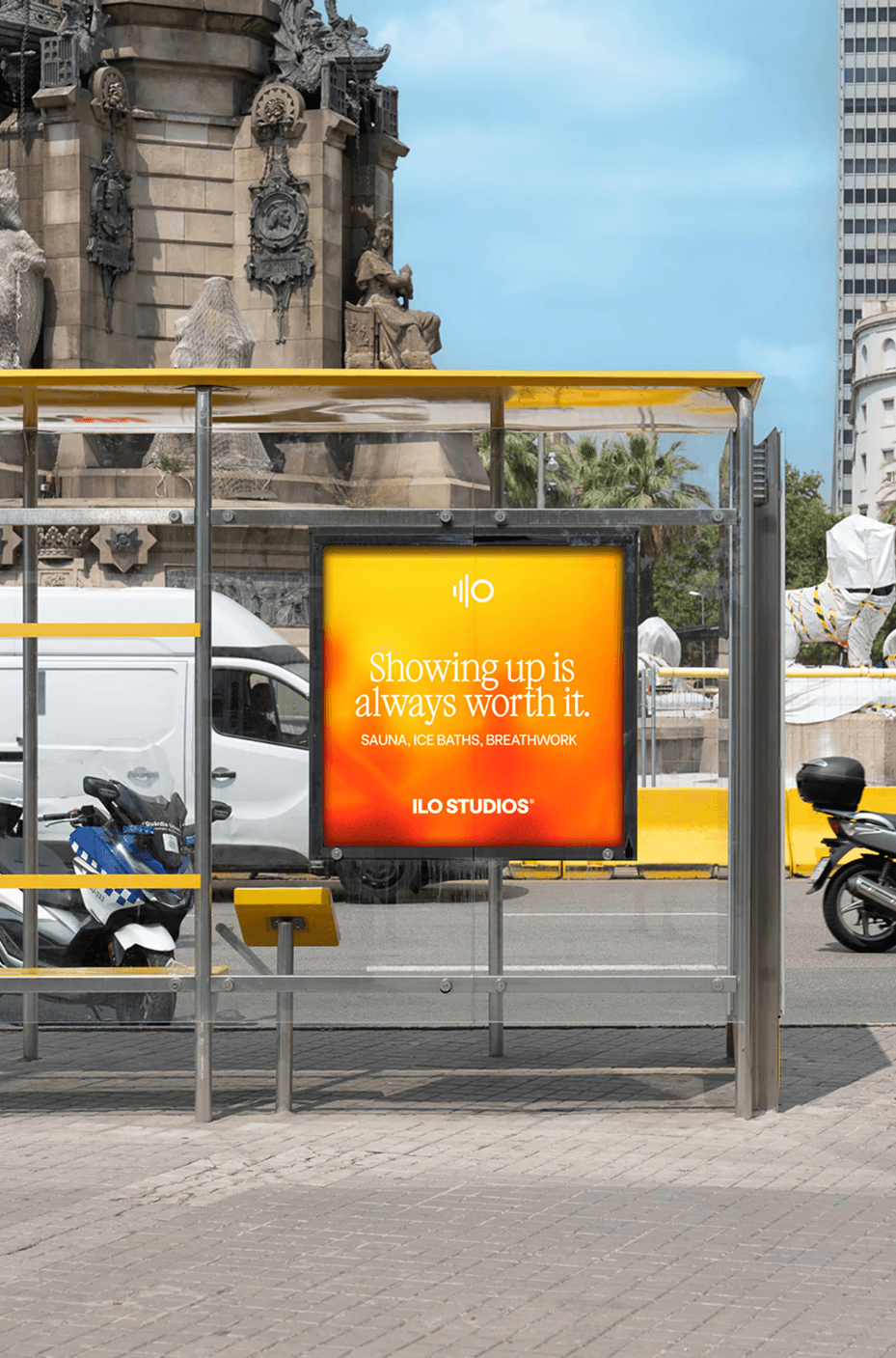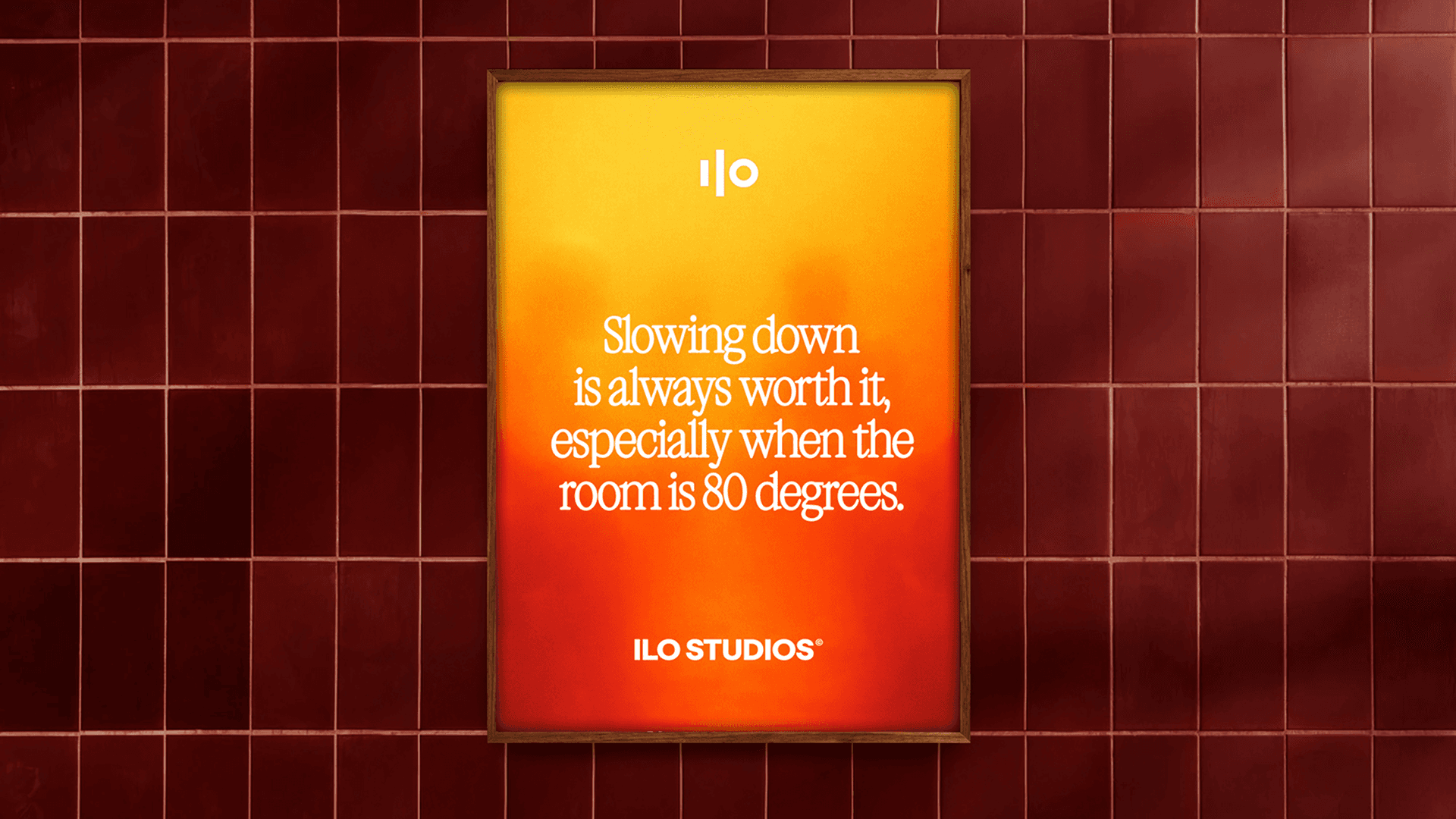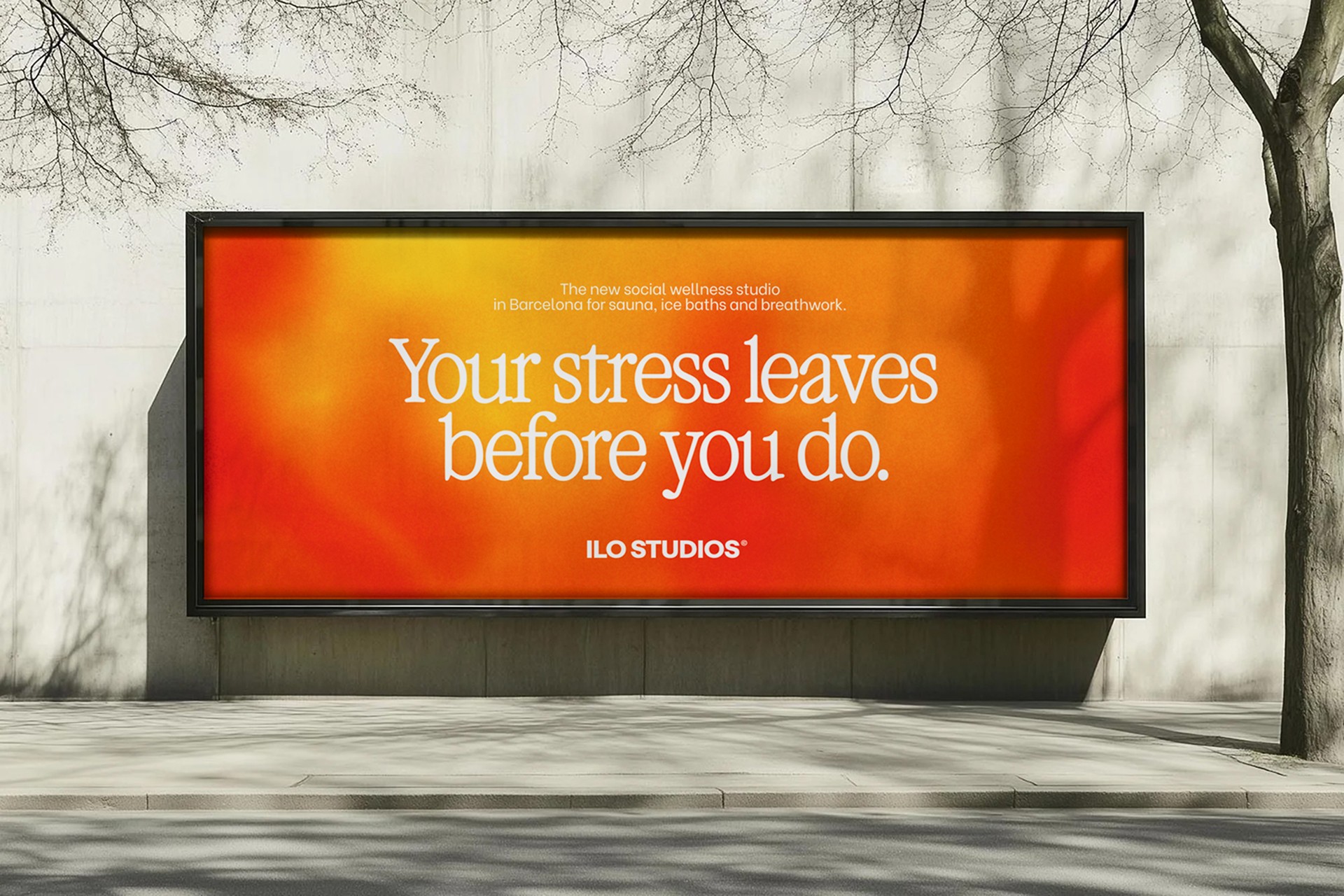 Typography. VC Garamond Condensed anchors the identity in something ancient and elemental. It connects to the Roman and Nordic bathing traditions that inspired ILO's practice, while feeling immediate and contemporary at scale, on signage, billboards and across the physical space.